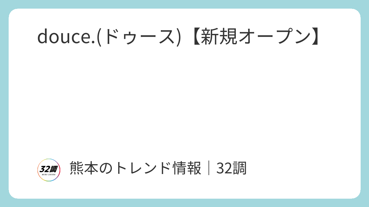 スポンサーリンク 熊本イベント情報 32調|地域情報 douce.(ドゥース)【新規オープン】 【熊本】開店情報 X Facebook はてブ LINE Pinterest コピー 2026.01.24 【熊本】開店情報 グルメ情報熊本市西区 行ってみたい オープン予定 油揚げの詰め放題で話題の田代食品さんが豆腐スイーツ専門店をオープンします。場所はトライアル上熊本店の近くです。 「douce.(ドゥース)」の営業時間・地図 【店名】douce.【新規オープン】【営業時間】【定休日】【住所】〒860-0082 熊本県熊本市西区池田2丁目44−16 ※掲載している内容は、ブログ管理人が調べた当時のものですので予めご了承ください。 行ってみたい 口コミ・コメント