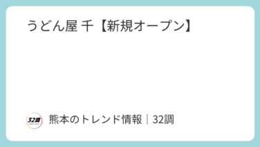 【熊本】開店情報 うどん屋 千【新規オープン】 健軍商店街に新しい飲食店がオープンしました。メニュー肉ば山盛りうどん 990円馬のホルモン煮込み 1,000円「うどん屋 千」の営業時間・地図【店名】うどん屋 千【営業時間】11:00〜14:00【定休日】土曜日・日曜日・不定休【住所】〒8... 2026.04.18 【熊本】開店情報