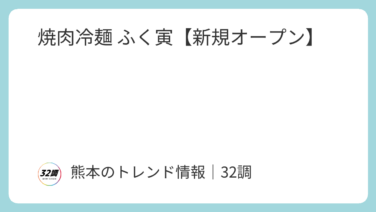 【熊本】開店情報 焼肉冷麺 ふく寅【新規オープン】 2026年2月初旬 新規オープンA5ランク和牛を低価格でご提供!本格焼肉と自家製冷麺が味わえる「焼肉冷麺 源助」の姉妹ブランドとして、長崎県に人気のお店みたいです。「焼肉冷麺 ふく寅【新規オープン】」の営業時間・地図【店名】焼肉冷麺 ふく寅... 2025.12.28 【熊本】開店情報