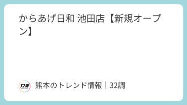 【熊本】開店情報 からあげ日和 池田店【新規オープン】 2026年3月13日 新規オープンからあげのテイクアウト専門店が、ミスターマックス熊本北店近くにオープンします。「からあげ日和 池田店」の営業時間・地図【店名】からあげ日和 池田店【営業時間】【定休日】【住所】〒860-0082 熊本県熊本... 2026.01.31 【熊本】開店情報
